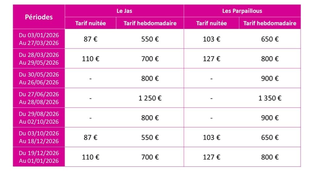 Durée de séjours : 3 nuits minimum en hors saison, 1 semaine en saison haute.